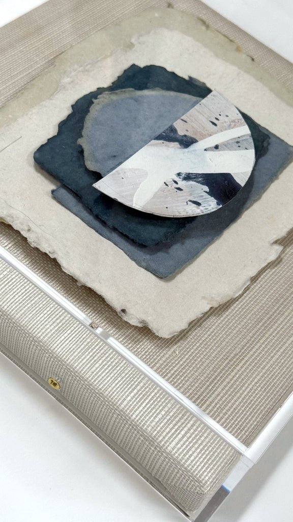 mixed media on handmade paper collage in shadow box frame with grasscloth backing
