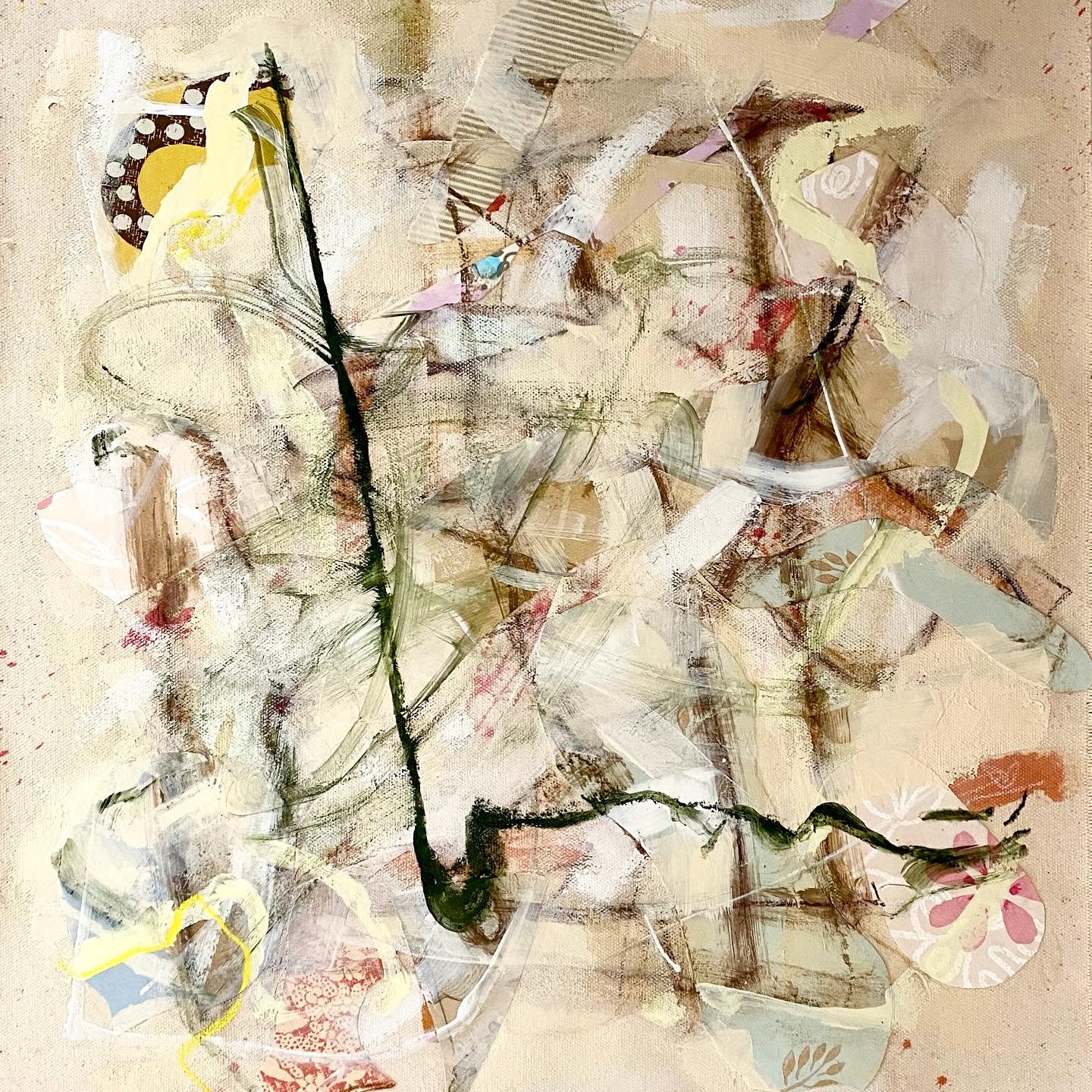 mixed media on heavy canvas, floating on mat, in gold frame with glass