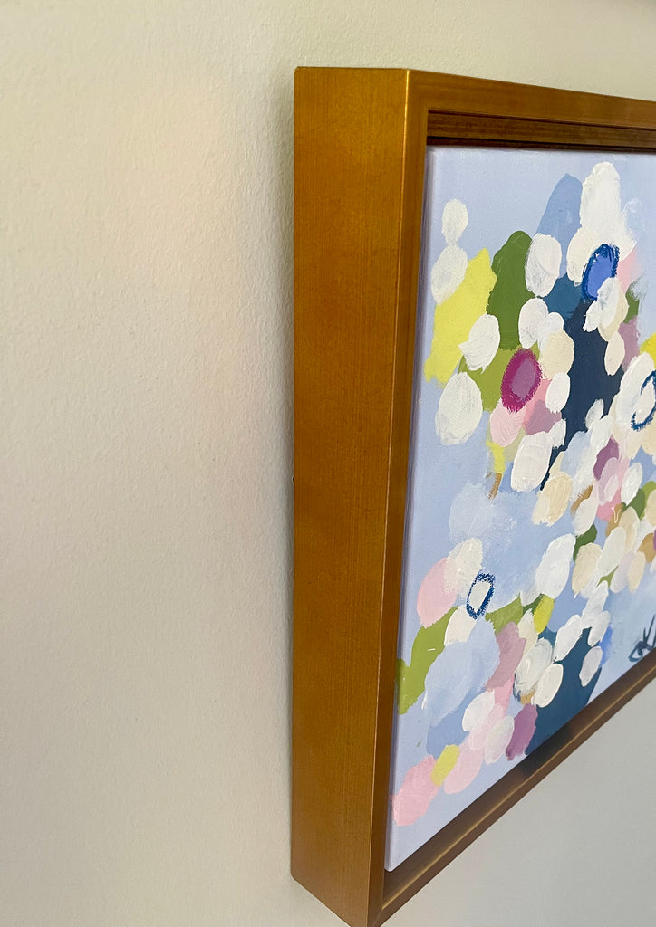 acrylic and oil pastel on gallery wrapped canvas, in gold floater frame